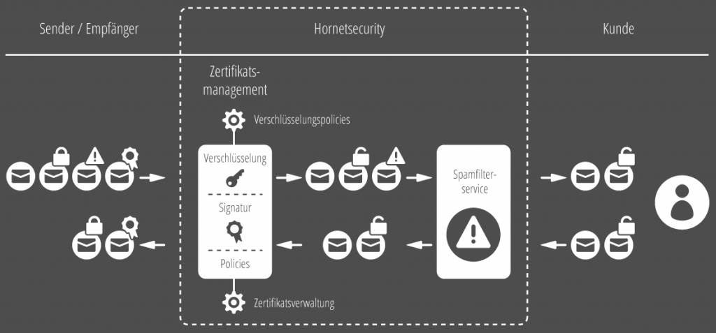 Der Verschlüsselungsservice von Hornetsecurity übernimmt das komplette Zertifikats-Management für die Kunden. Ver- und Entschlüsselung sowie Signierung erfolgen vollautomatisch und transparent ohne Benutzereingriffe.